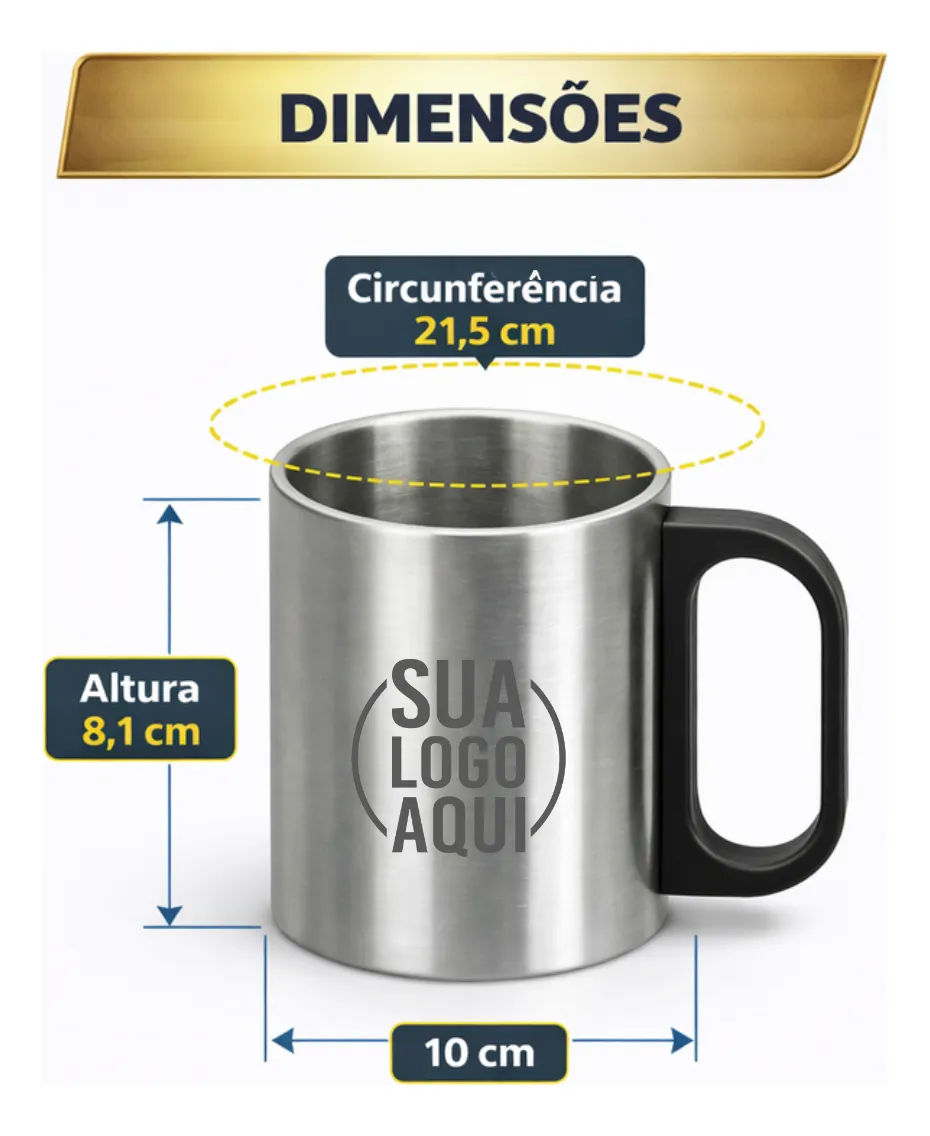 Caneca de inox 180ml com cabo e tampa em plástico resistente (não é térmica).